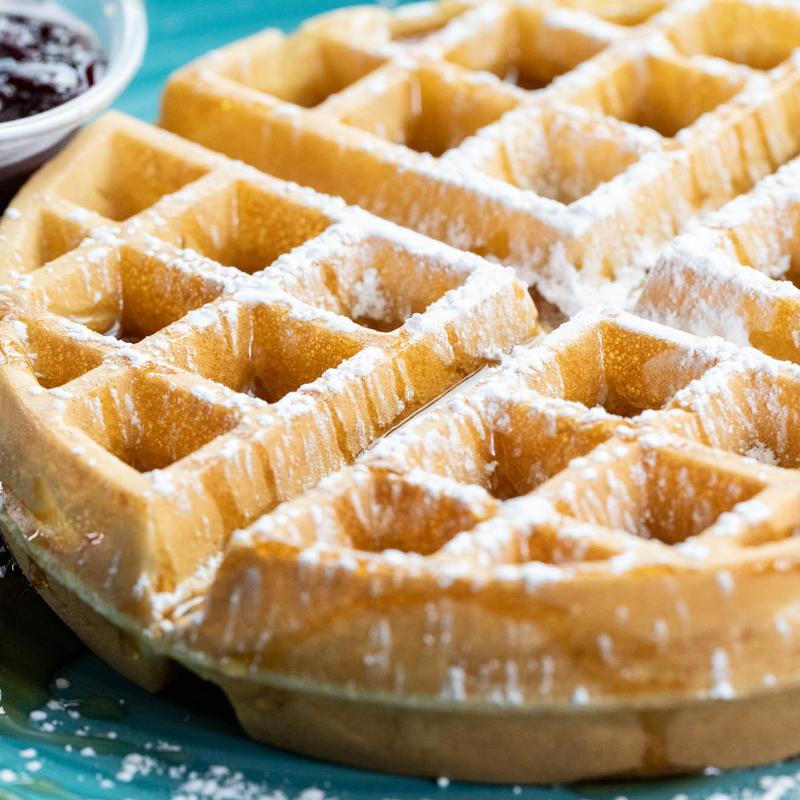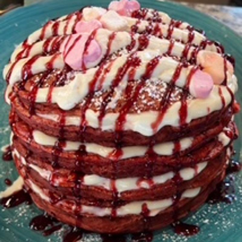 a stack of Red Velvet pancakes with a sweet cream cheese fill