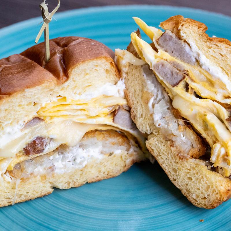 hashbrown, eggs, gruyere cheese ,pork sausage omlet style with lemon oregano aioli, on a roll