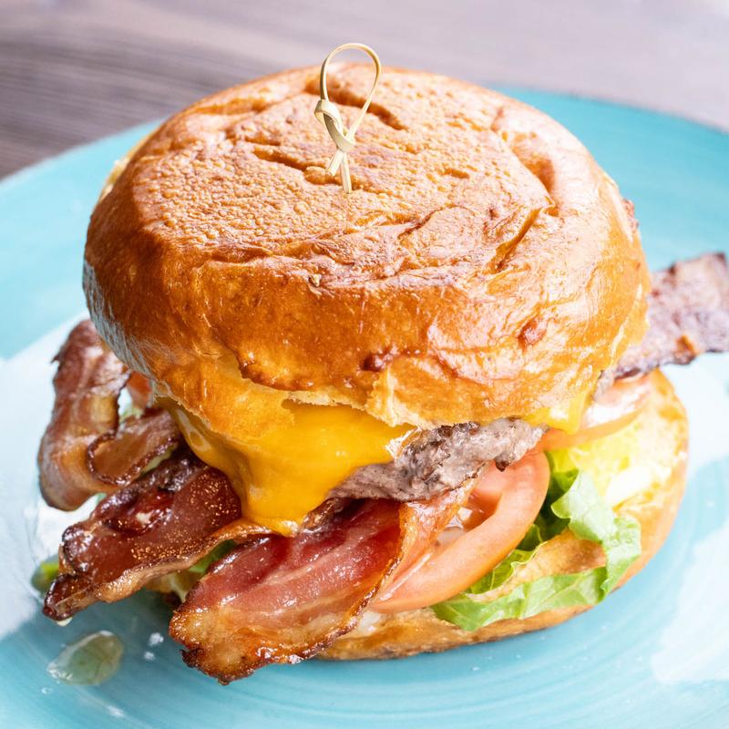 fresh ground beef burger with bacon lettuce tomato and choice of cheese made to your tempeture