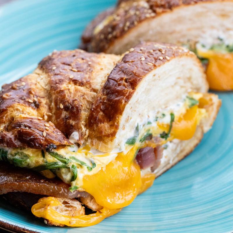 Thick-cut maple bacon, scrambled egg with jalapenos, chives, cheddar cheese, sour cream on a Pretzel Croissant